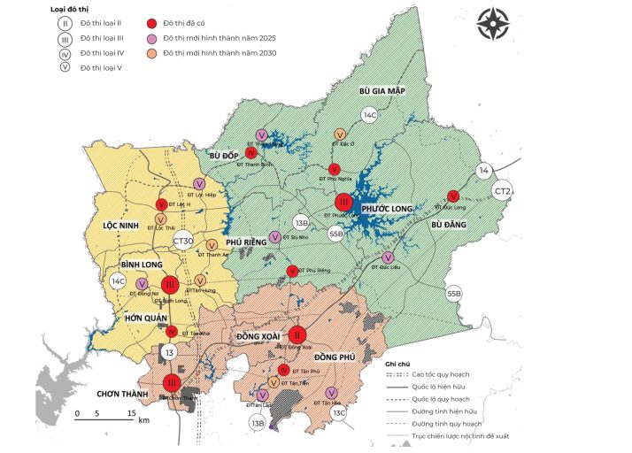 Trong giai đoạn 2026 – 2030, đầu tư phát triển đô thị Đồng Xoài hướng đến là đô thị loại II. Đầu tư phát triển đô thị Bình Long, Phước Long, Chơn Thành hướng đến là đô thị loại III.